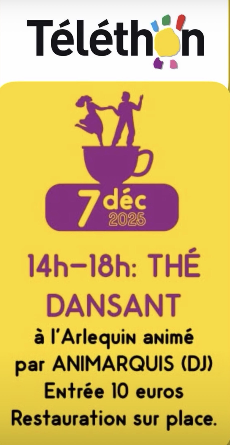 🟢 7 décembre 14h-18h : THÉ DANSANT à L'Arlequin animé par Animarquis (DJ). Entrée 10€, restauration sur place.