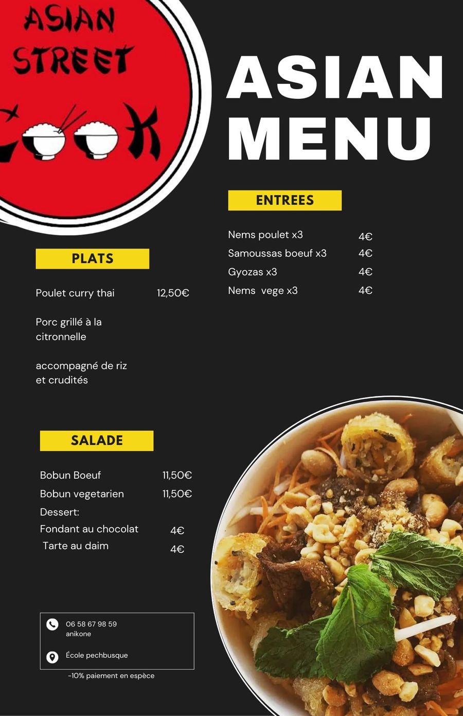 Vous trouverez le menu en pièce jointe. Les nouilles sautées seront proposées en accompagnement et Asian Street Food vous propose une remise de -10% pour tout paiement en espèces.