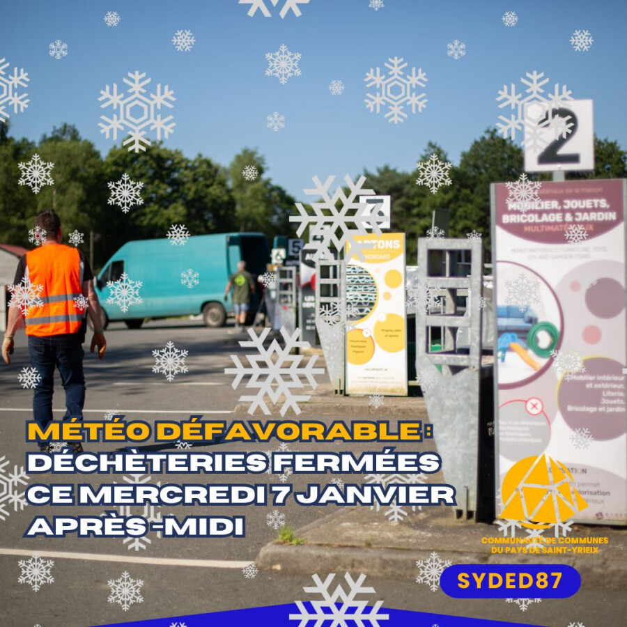 En raison des conditions météorologiques et par mesure de sécurité pour le personnel et les usagers, toutes les déchèteries du SYDED seront fermées ce mercredi 7 janvier après-midi.