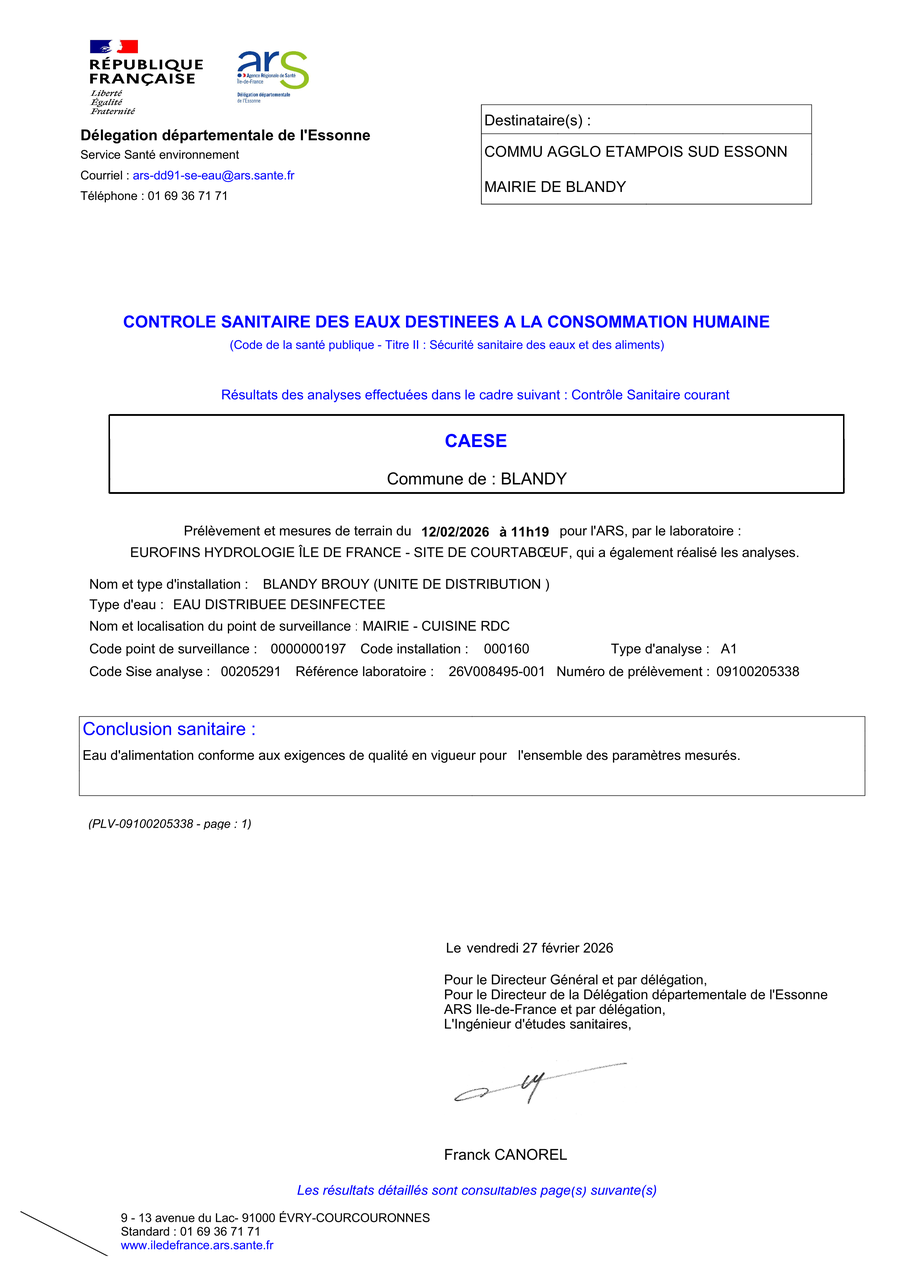 bulletin relatif aux derniers résultats d'analyse du contrôle sanitaire réglementaire