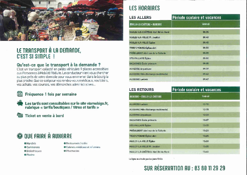 Chaque vendredi matin (sauf jour férié), un bus permettra toujours aux habitants du sud du territoire de se rendre à Vermenton pour leurs démarches et achats du quotidien : maison de santé, pharmacie, marché, commerces, etc…