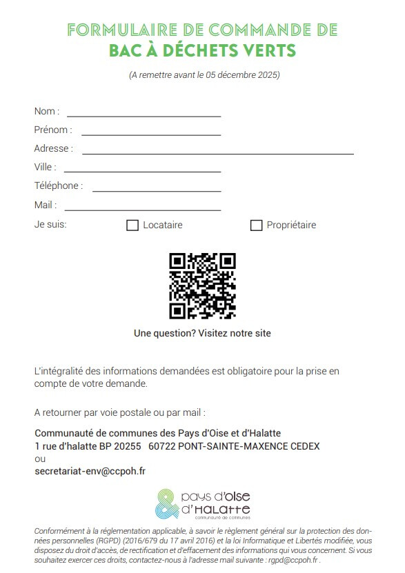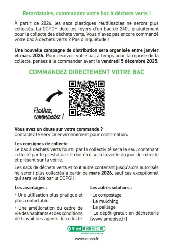 Comme vous le savez, la Communauté de Communes des Pays d’Oise et d’Halatte a doté une grande partie de ses habitants de bacs à déchets verts, en remplacement des sacs réutilisables, au cours de l’année 2025.