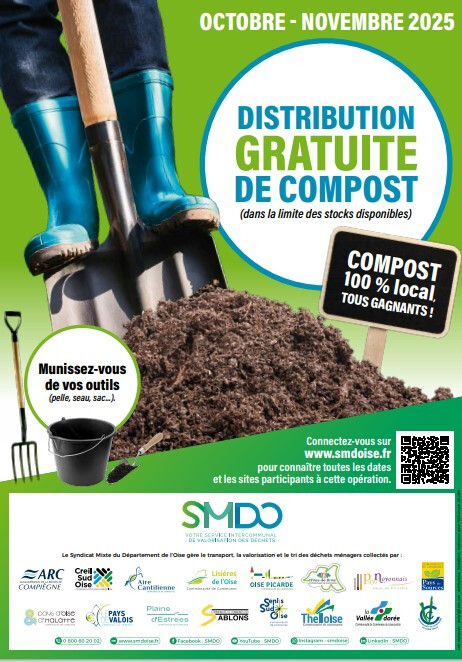 En partenariat avec le SMDO et la commune de Brenouille, le service Environnement organise une distribution gratuite de compost le samedi 25 octobre, de 9h à 13h, sur le parking du collège René Cassin 60870 Brenouille