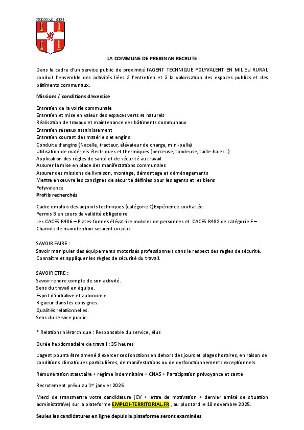 Pour postuler, cliquez sur ce lien : https://www.emploi-territorial.fr/offre/o032251009000610-agent-interventions-techniques-polyvalent-milieu-rural