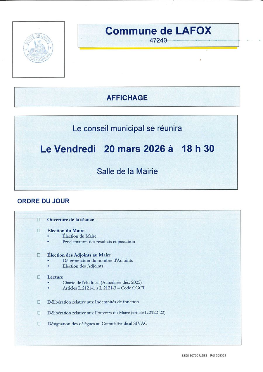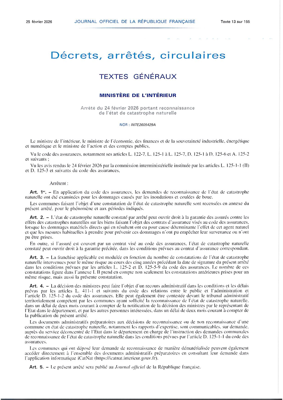 Nous vous informons que la commune de Lafox a été officiellement reconnue en état de catastrophe naturelle par arrêté du 24 février 2026, publié au Journal Officiel de la République française.