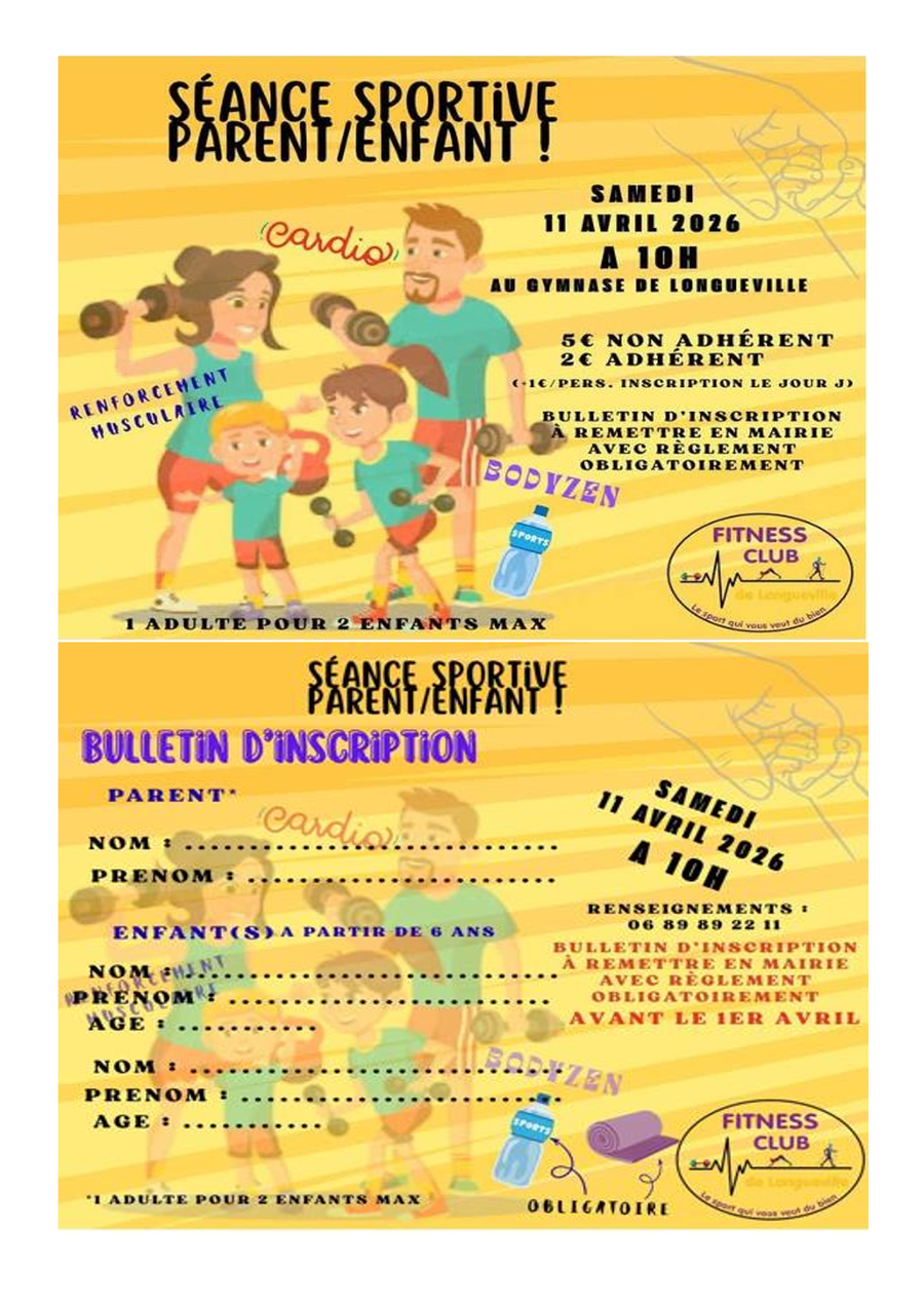 L'association du Fitness club de Longueville sur Scie organise une séance sportive parents/enfants le samedi 11 avril 2026, à 10 h 00, au gymnase de Longueville sur Scie.