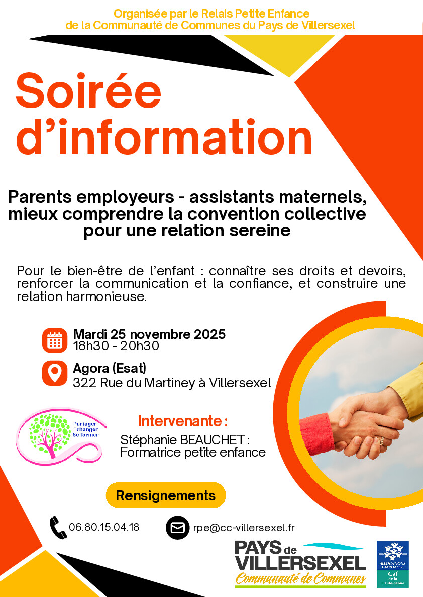 Afin d'accompagner les familles et les assistantes maternelles dans leurs démarches et relations professionnelles, le Relais Petite Enfance de la Communauté de Communes du Pays de Villersexel organise une soirée d’information à destination des parents employeurs et des assistantes maternelles le