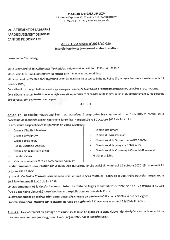 - Stationnement et circulation seront interdits chemin de Bligny depuis la D386 jusqu'au chemin d'exploitation des prés de la porte.