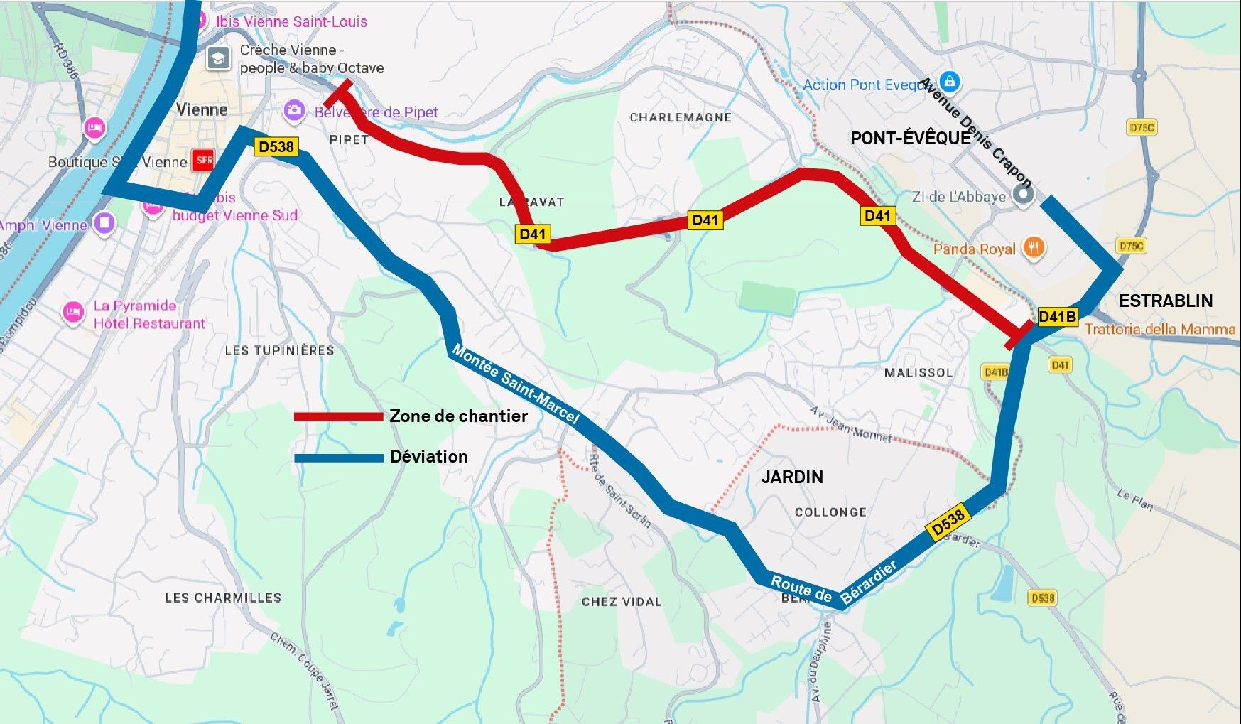 - Pour les déplacements entre l’est et le centre de vienne : des déviations seront installées chaque soir via la route de Bérardier et la montée Saint-Marcel (D538). Les entreprises situées sur la zone d’activité de Pont-Évêque restent toutes accessibles.