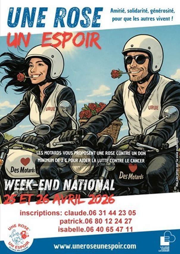 🌹Rendez-vous les 25-26 avril pour 'Une Rose Un Espoir 2026'. 🏍️ Avec une contribution de 2€ ou plus, emportez votre rose et soutenez la lutte contre le cancer! 🌹