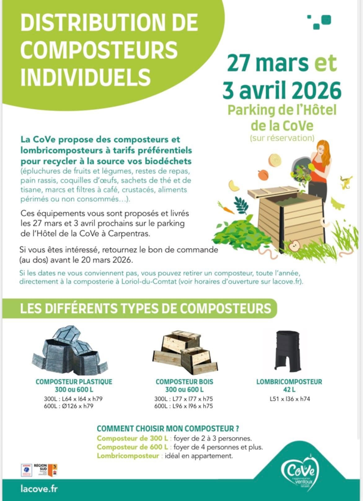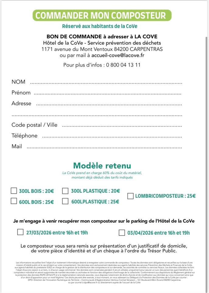 la CoVe organise 2 distributions de composteurs individuels à récupérer directement sur le parking de l'Hôtel de Communauté à Carpentras les 27 mars et 3 avril prochains, dates pour lesquelles