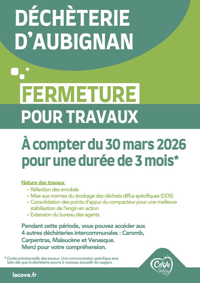 Pendant cette période, les usagers peuvent se rendre dans les 4 autres déchèteries intercommunales du territoire de la CoVe : Caromb, Carpentras, Malaucène et Venasque.