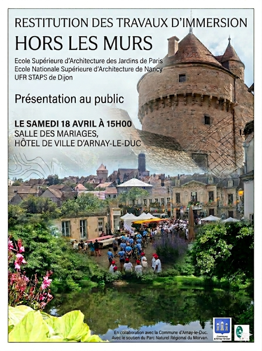 En Octobre dernier, Arnay-le-Duc a accueilli le dispositif « Hors les Murs » composé d’étudiants pluridisciplinaires (architecture, urbanisme, paysage et sport) chargés d’élaborer un diagnostic partagé et proposer des pistes de développement adaptées aux enjeux spécifiques du territoire.