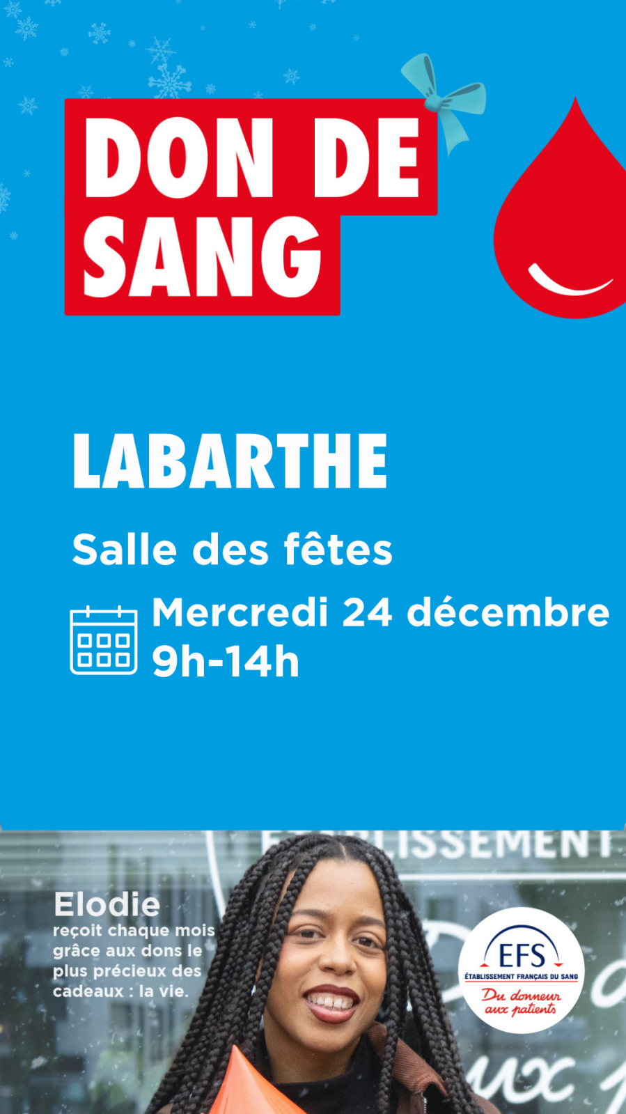 Don de sang à la salle des fêtes de Labarthe le mercredi 24 décembre de 09h à 14h00