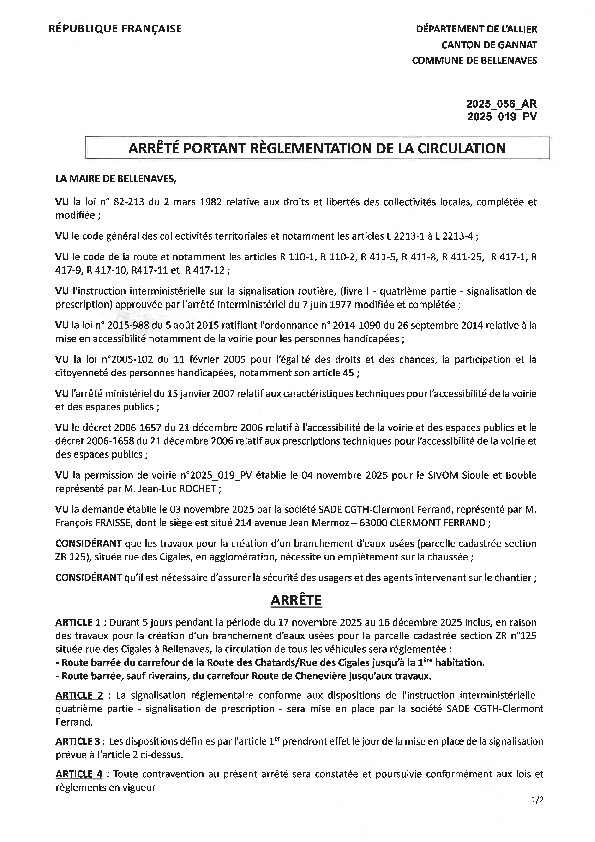 Durant 5 jours pendant la période du 17 novembre 2025 au 16 décembre 2025 inclus, en raison des travaux pour la création d'un branchement d'eaux usées pour la parcelle cadastrée section ZR n°125 située rue des Cigales à Bellenaves, la circulation de tous les véhicules sera réglementée :