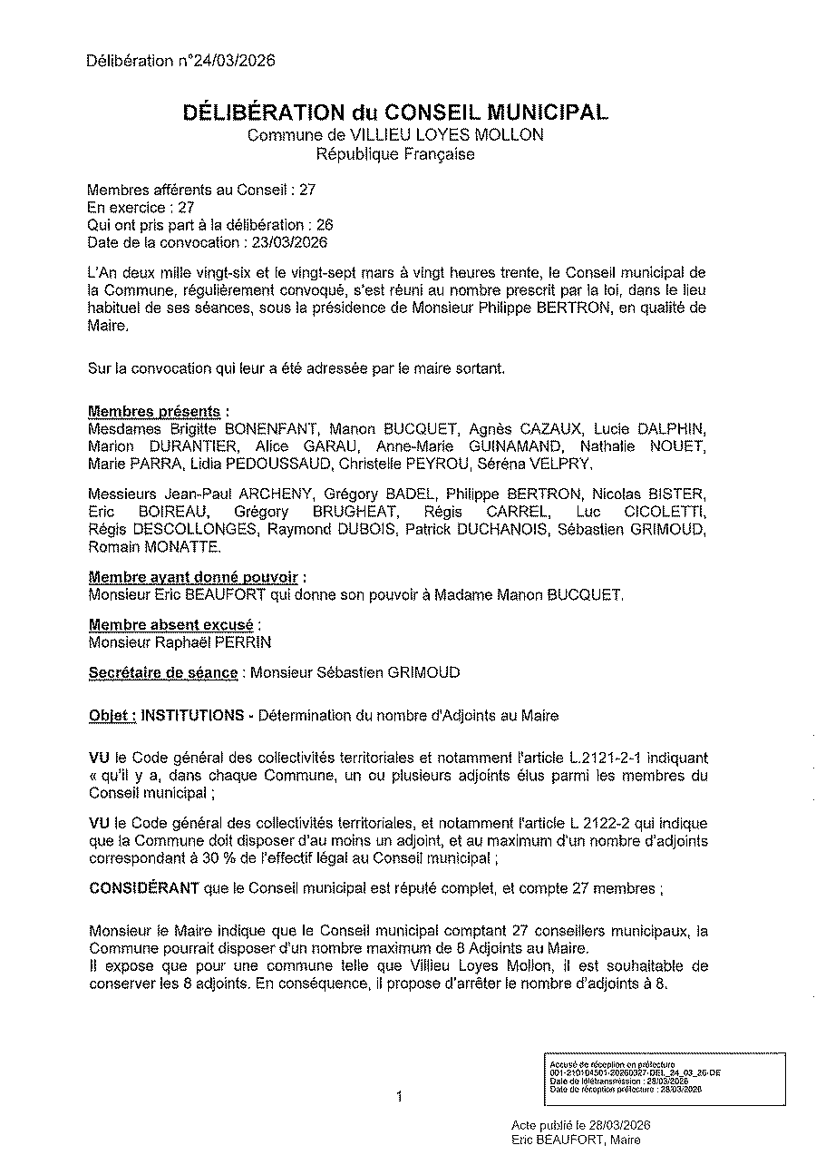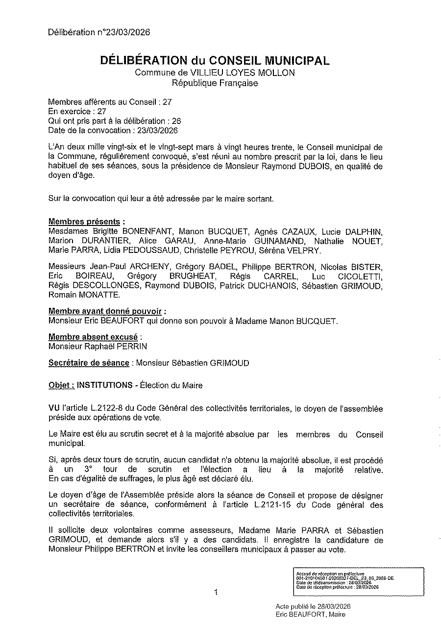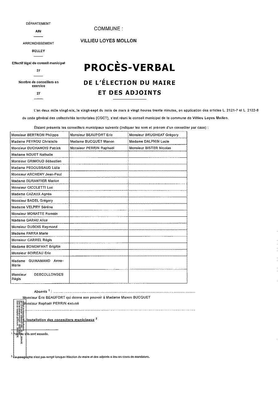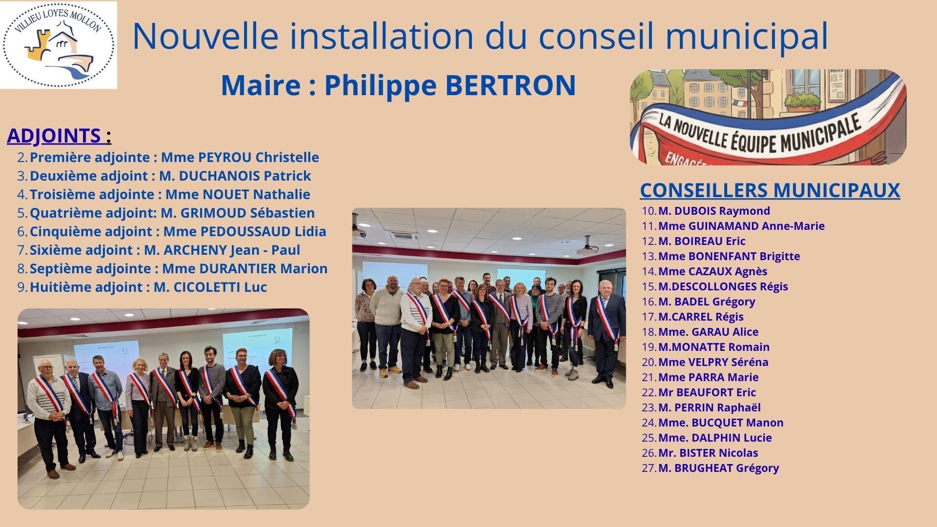 la nouvelle installation du conseil municipal avec Monsieur BERTRON Philippe le nouveau Maire.