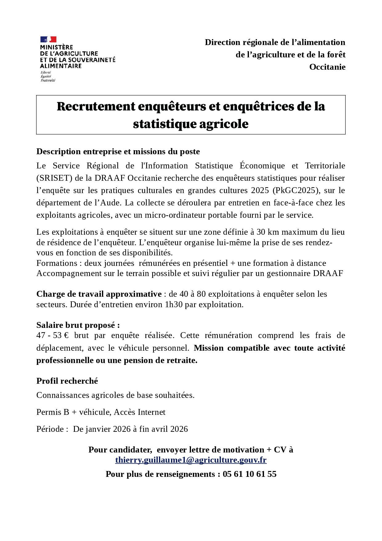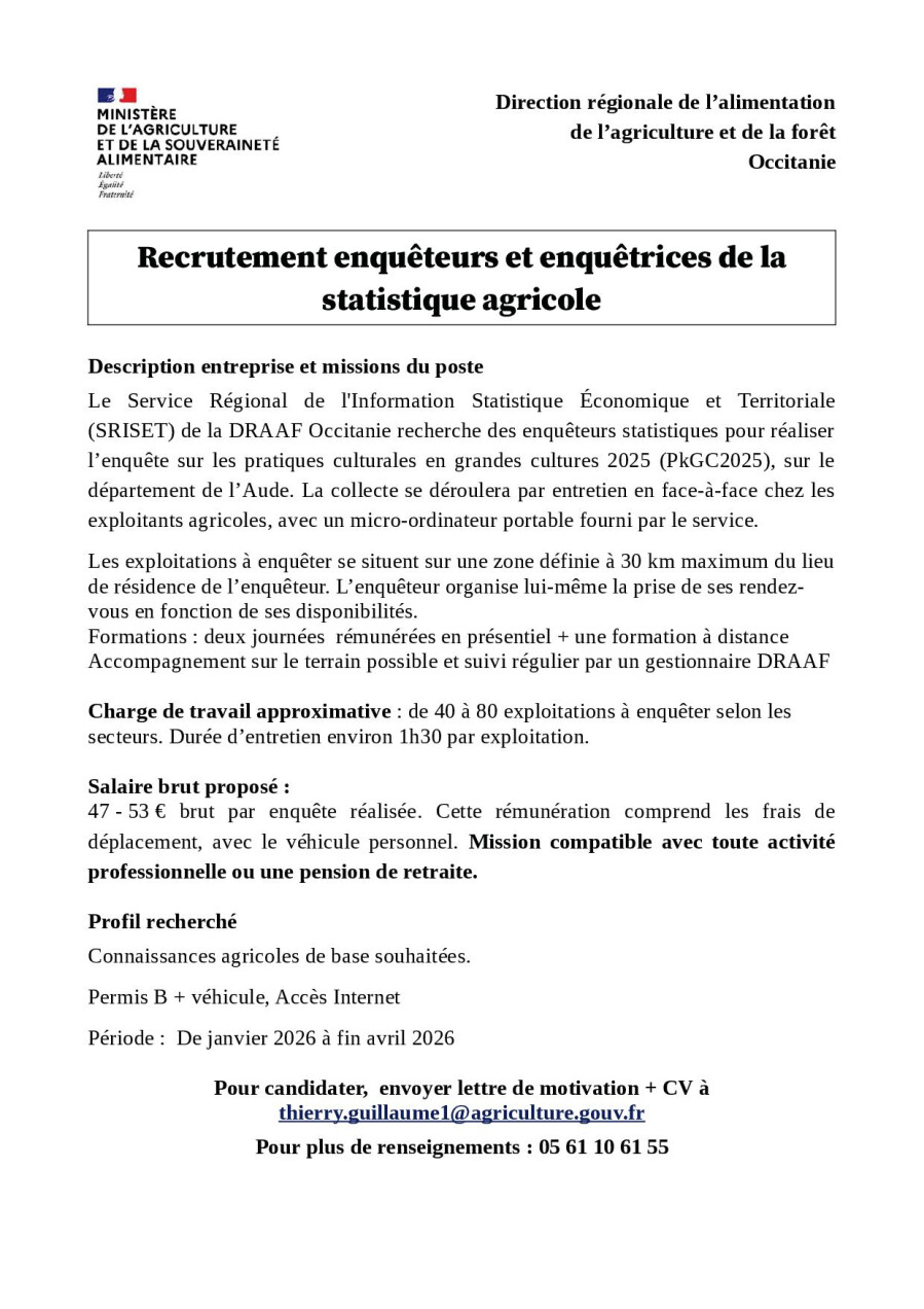 Recrutement enquêteurs et enquêtrice de la statistique agricole