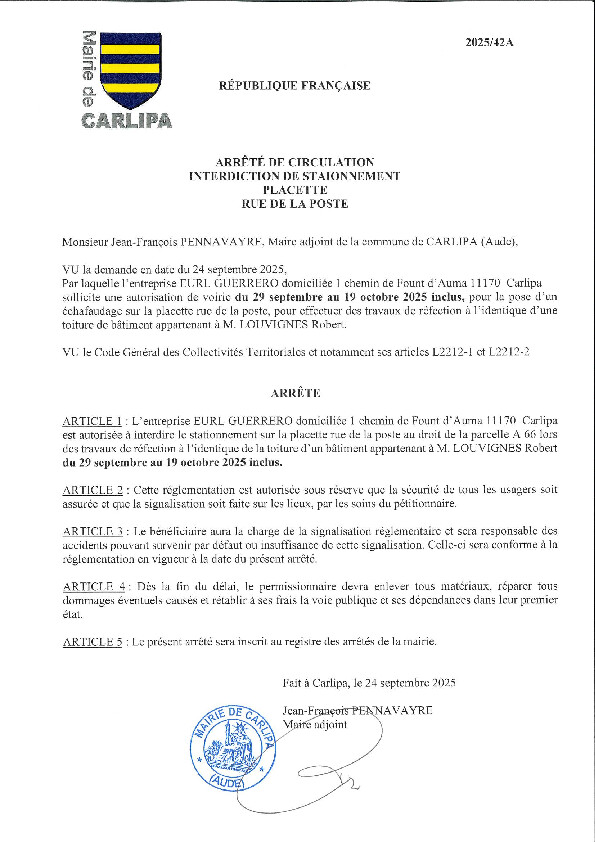 Ci-dessous, arrêté 2025/42A du 24 septembre 2025.