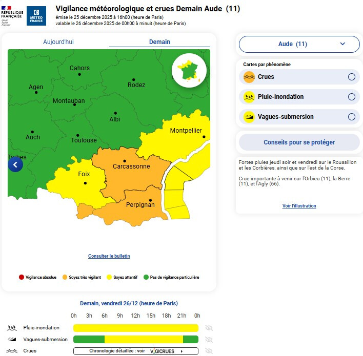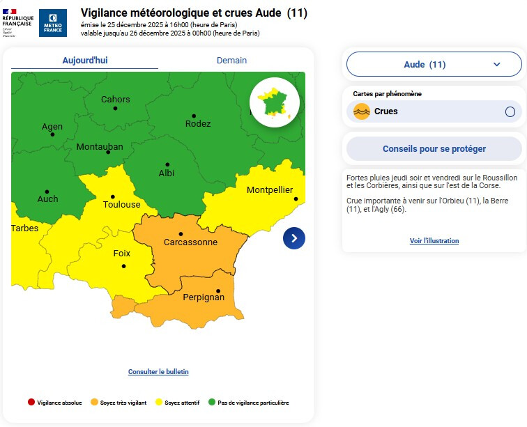 🟠 Vigilance orange crues dès ce soir pour les cours d'eau de la Berre, de l'Orbieu et de l'Aude (tronçon Haute-Vallée)