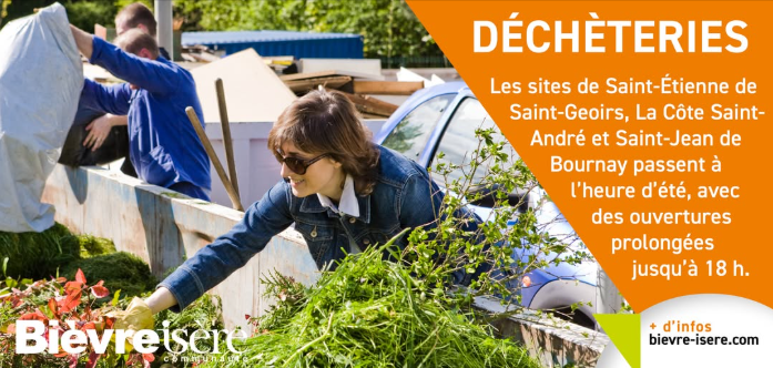 À partir du lundi 30 mars, les déchèteries intercommunales à Saint-Étienne de Saint-Geoirs, La Côte Saint-André et Saint-Jean de Bournay passent à l'heure d'été, avec des ouvertures prolongées jusqu'à 18 heures.