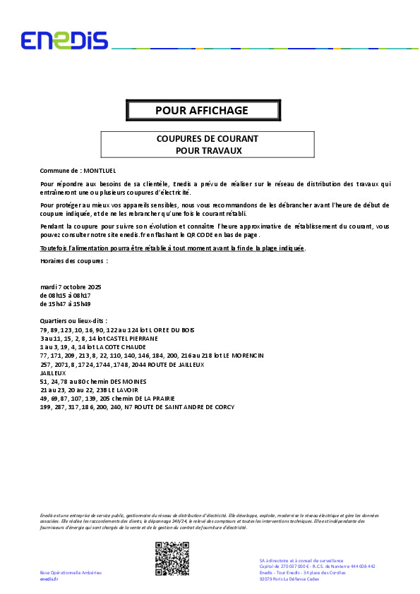 ENEDIS vous informe qu'en raison de travaux, des coupures de courant sont prévues :