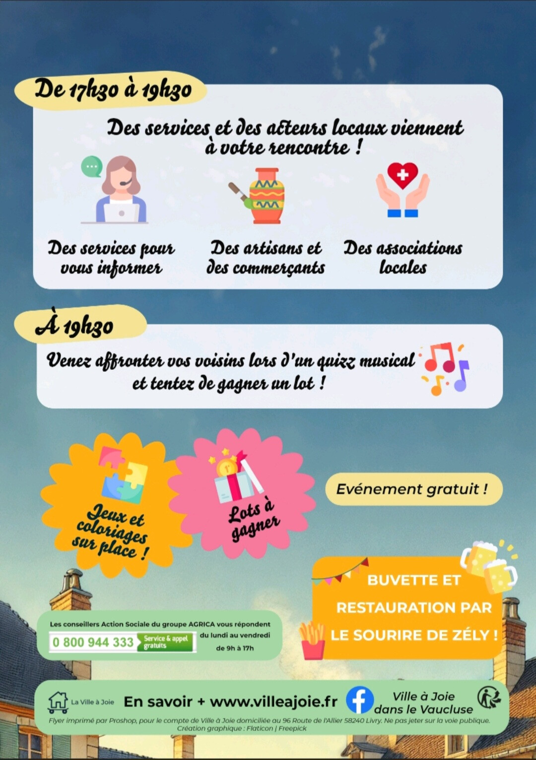 🎶 Et n'oubliez pas, une soirée sans animation ne serait pas complète ! Alors venez affronter vos voisins lors d'un quizz musical endiablé à 19h30 et tentez de remporter un lot !