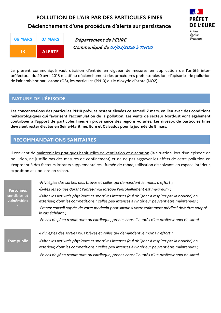 Vous trouverez ci-dessous le communiqué de presse concernant une pollution de l'air aux particules fines prévue pour les journées du 07 et 8 mars 2026 dans le département de l'Eure .