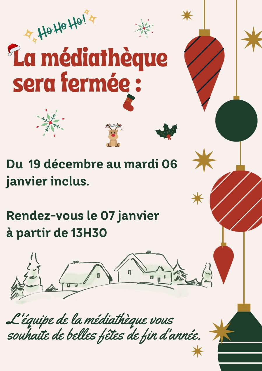 Nous vous informons qu’à compter du 1er novembre 2025, la médiathèque ne sera plus ouverte au public le vendredi soir, de 16h00 à 18h00.