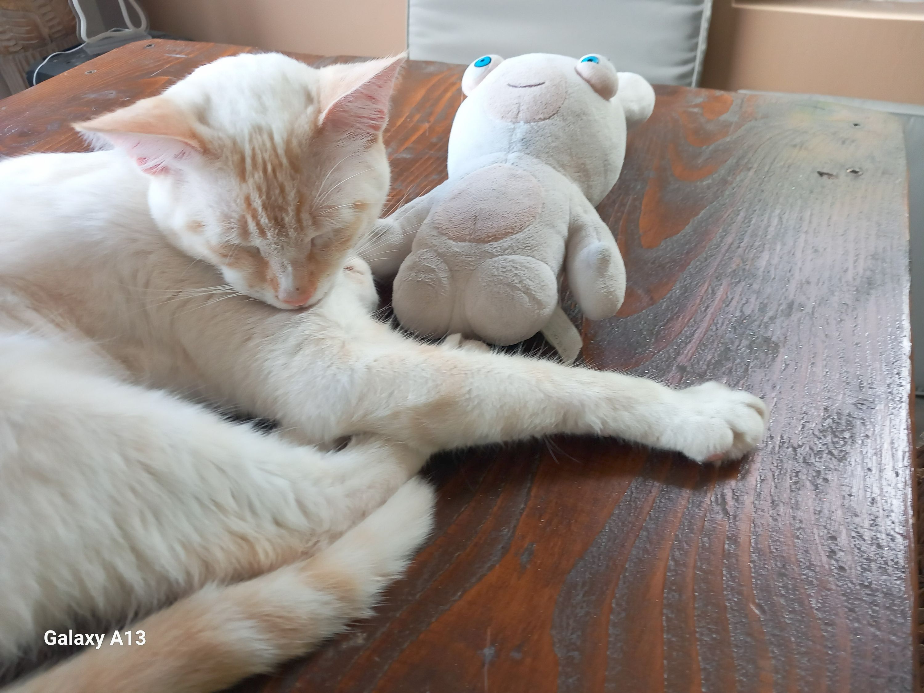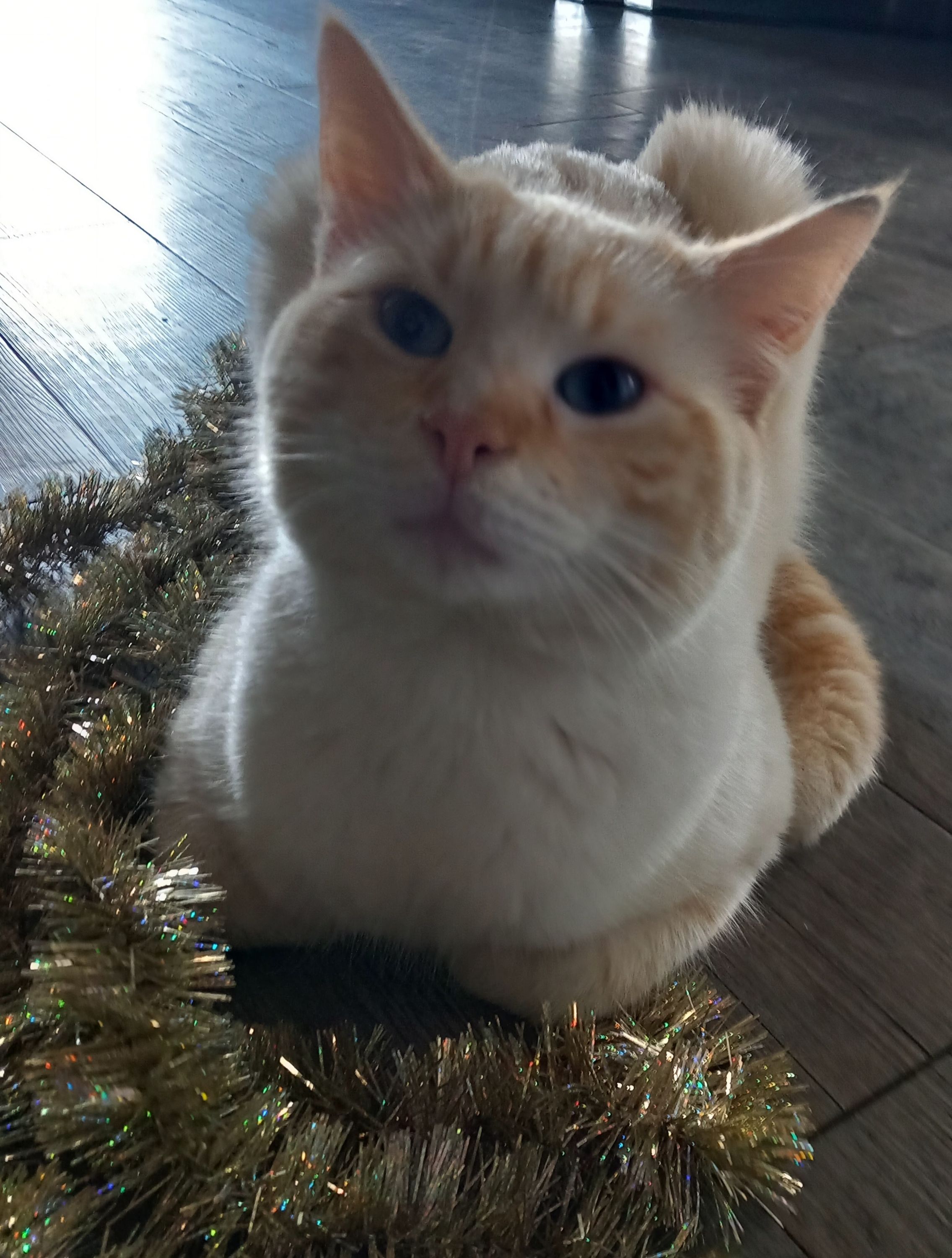 yeux bleus, poils blanc, pelage tabby roux