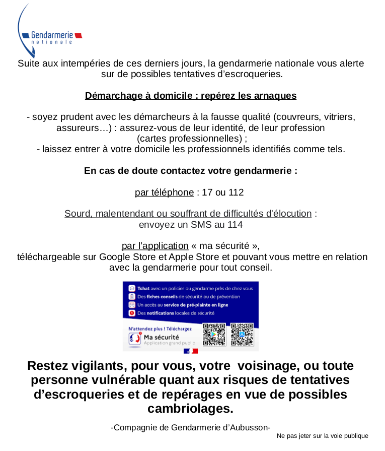 Suite aux intempéries de ces derniers jours, la gendarmerie nationale vous alerte sur de possibles tentatives d escroqueries.