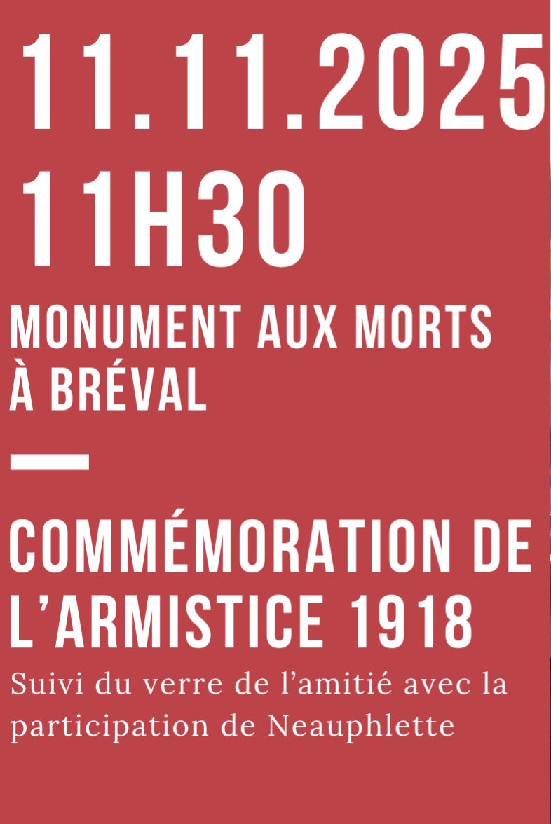 Nous vous donnons RDV au Monument aux Morts de Bréval à 11h30 ce mardi 11 novembre pour la commémoration de l'Armistice 1918.