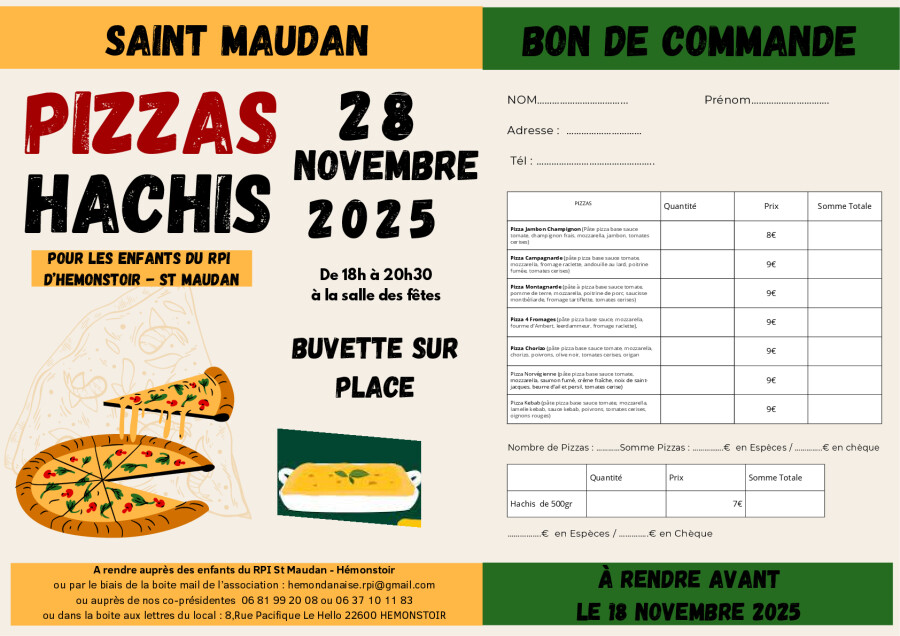 L'Hémondanaise organise une vente de pizza et hachis pour les enfants du RPI Hémonstoir / Saint-Maudan: