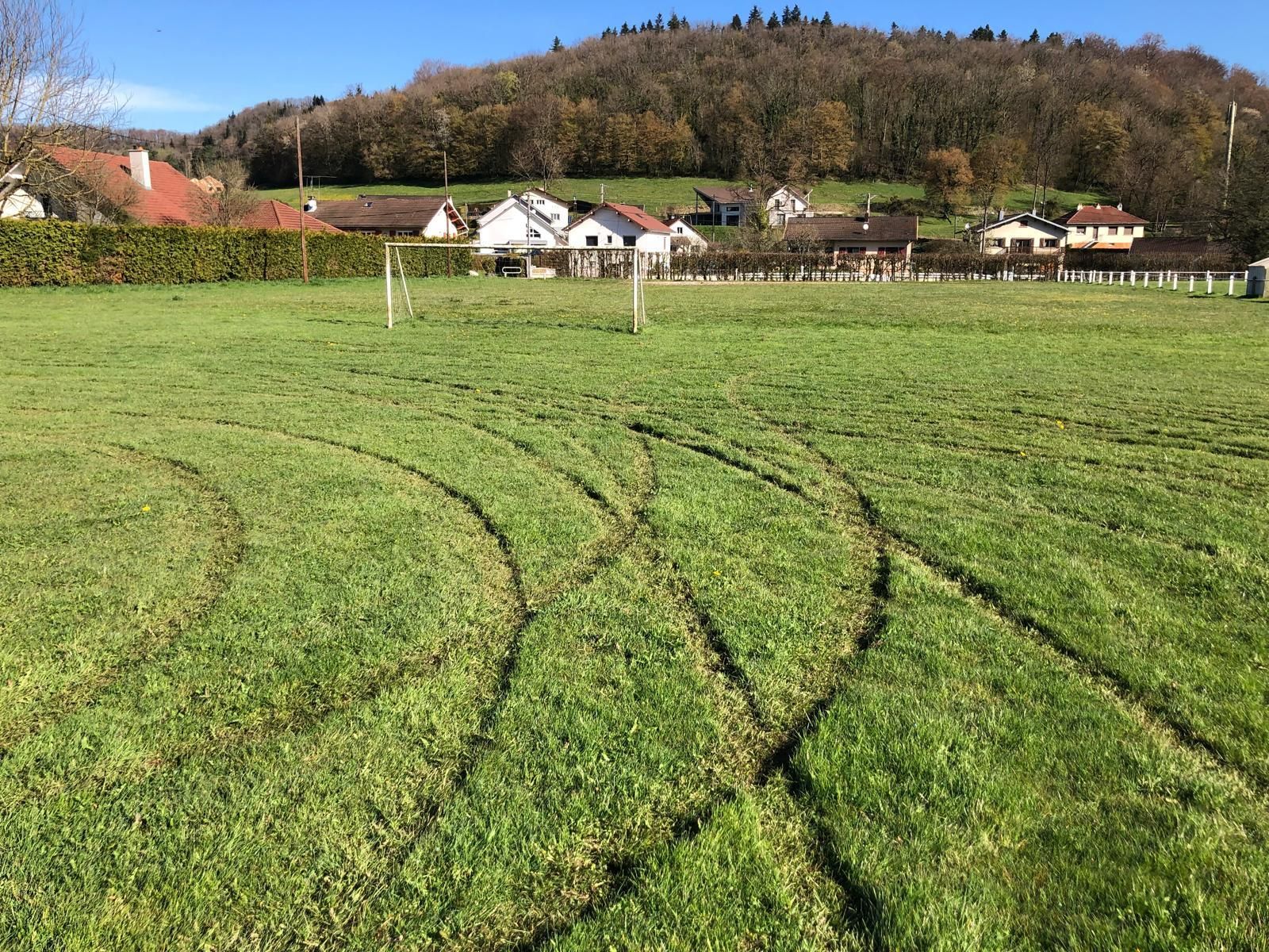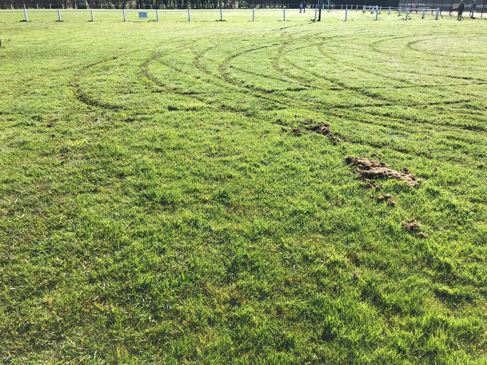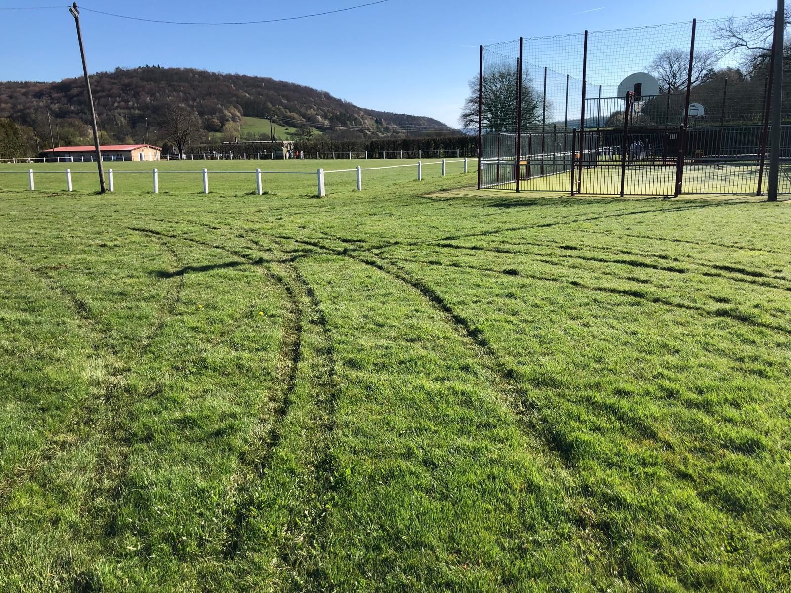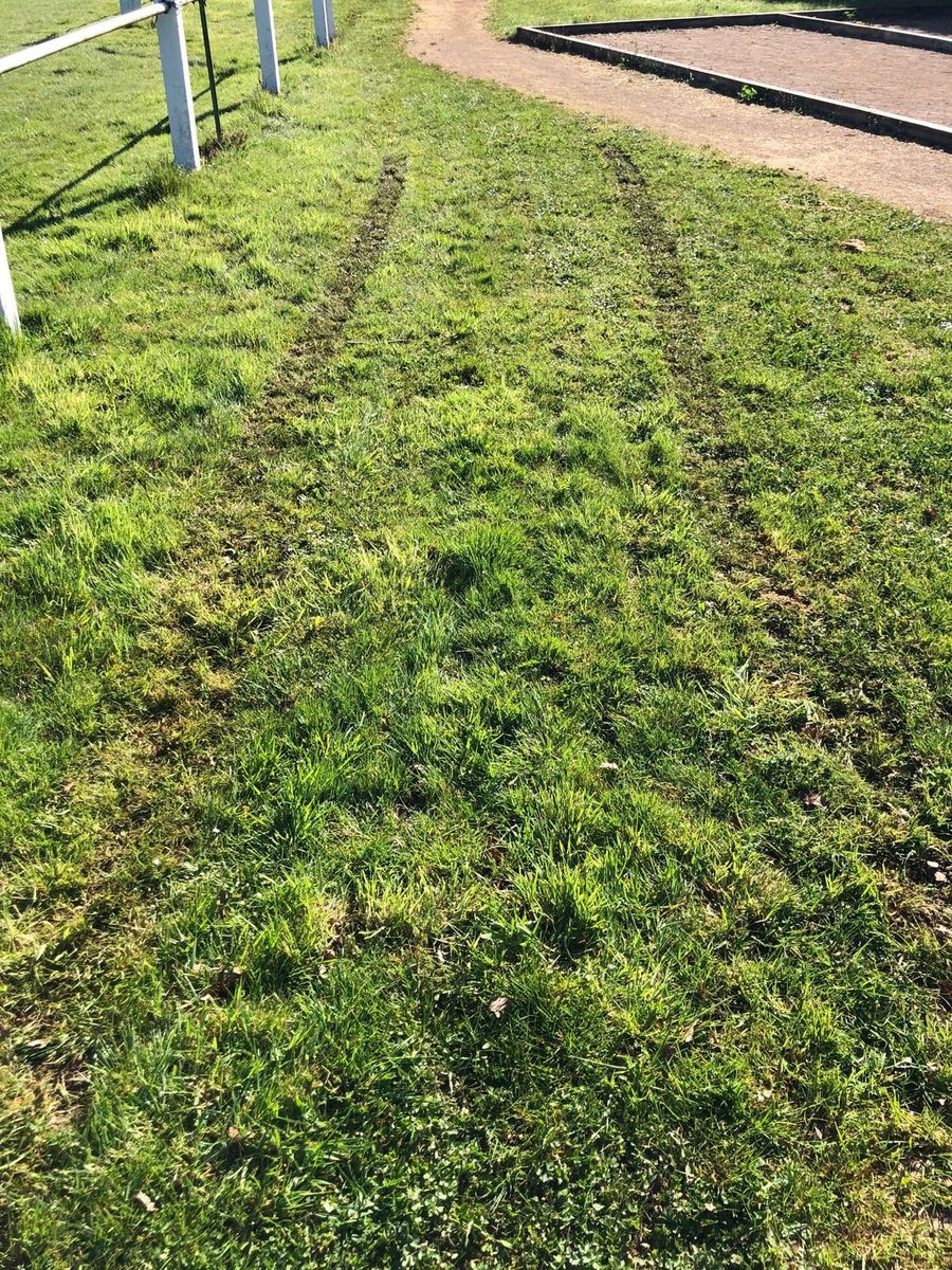 DES PETITS MALINS ONT MANIFESTEMENT JUGES INTELLIGENT D'ALLER FAIRE DU RODEO EN VOITURE SUR LE TERRAIN D'ENTRAINEMENT DU STADE.