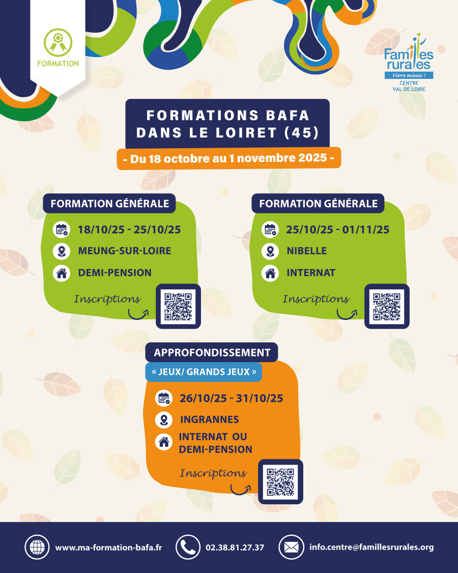 Familles Rurales Centre-Val de Loire organise 3 sessions de formation BAFA dans le département du Loiret.