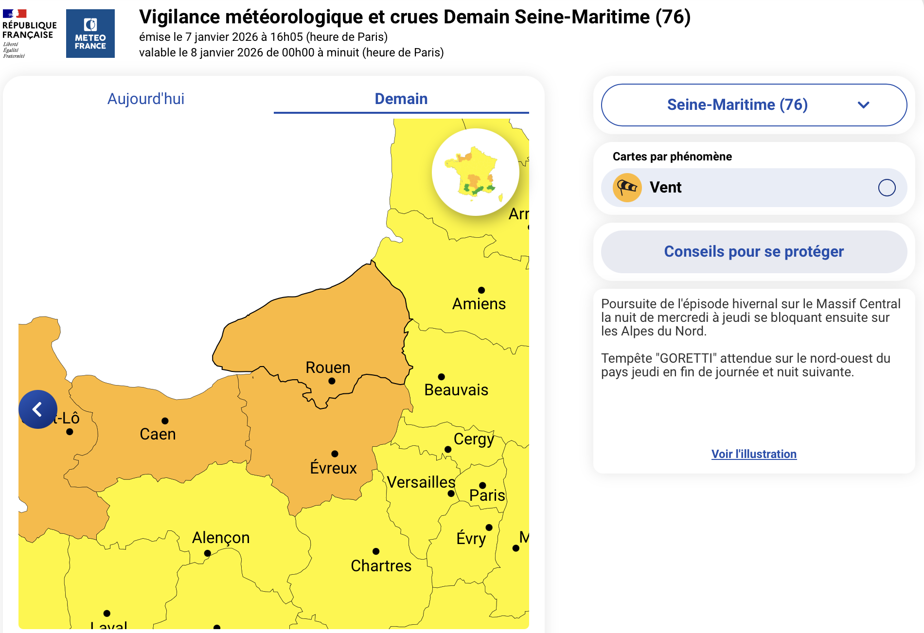 Plus d'informations : https://vigilance.meteofrance.fr/fr/seine-maritime/demain