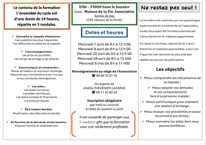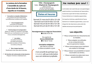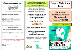 L’association France Alzheimer Jura propose une session de formation pour les aidants familiaux de personnes atteintes de troubles cognitifs, de la maladie d’Alzheimer et/ou de maladie apparentée.