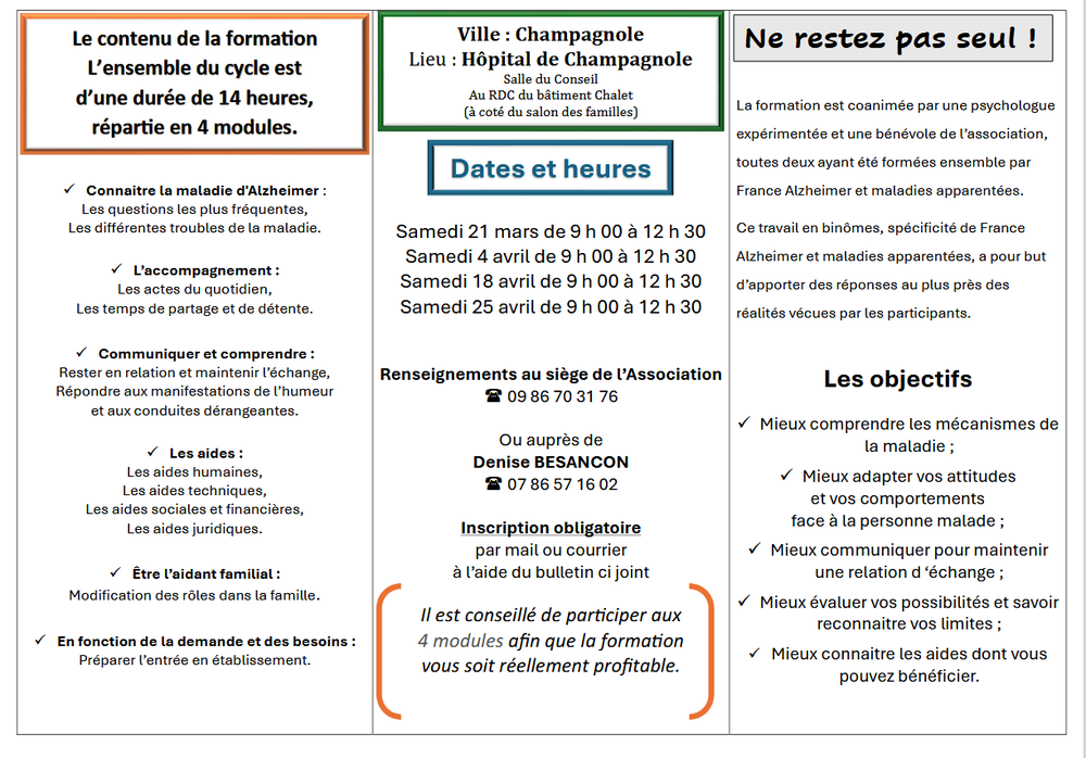 La formation est encadrée par une psychologue et une bénévole de l’association, toutes deux formées par l’union nationale France Alzheimer et maladies apparentées.