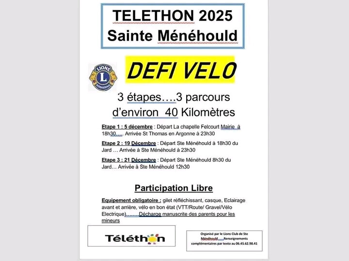 Le 19 décembre prochain, et comme chaque année, le défi sportif vélo TELETHON 2025 s'arrêtera dans notre commune