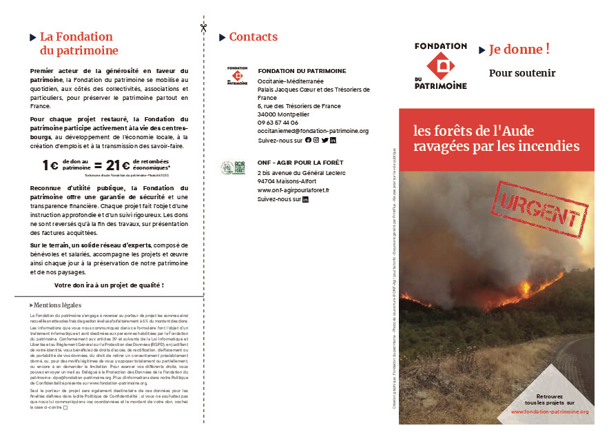 La Fondation du patrimoine et l'ONF, via son fonds de dotation (Agir pour la forêt), se mobilisent en lançant une collecte de dons exceptionnelle suite aux terribles incendies qui ont ravagé le patrimoine naturel de l'Aude cet été 2025.