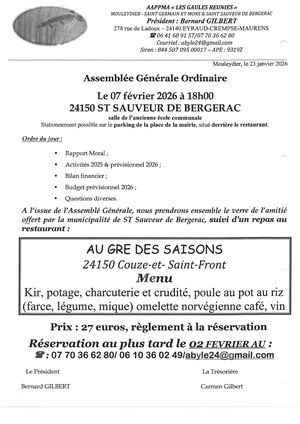 🥂 À l’issue de l’Assemblée Générale, un verre de l’amitié sera offert par la municipalité de Saint-Sauveur-de-Bergerac, suivi d’un repas au restaurant