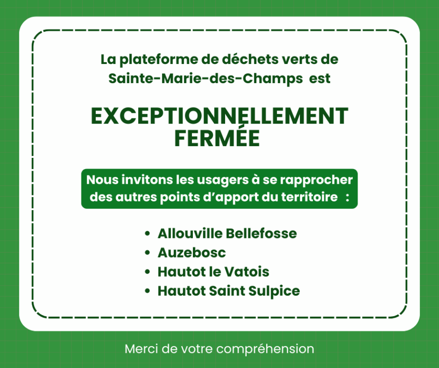 La plateforme de déchets verts de Sainte-Marie-des-Champs est exceptionnellement fermée.