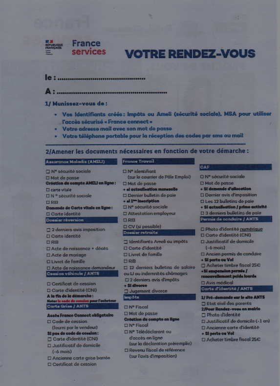 Pour vos rendez-vous, n'oubliez pas les documents nécessaires à votre démarche (voir le document ci-joint).