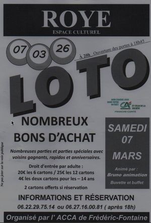 Le Loto de l'ACCA de Frédéric Fontaine aura lieu le 7 mars 2026 à 20h00 à l'Espace culturel de Roye .