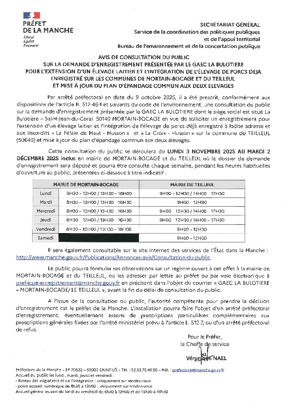 Une consultation du public d'une durée de quatre semaines sera ouverte du LUNDI 3 NOVEMBRE 2025 AU MARDI 2 DECEMBRE 2025 inclus en mairie de MORTAIN-BOCAGE et du TEILLEUL, sur la demande d'enregistrement présentée par le GAEC LA BULOTIERE en vue de solliciter un enregistrement pour l’extension d’un élevage laitier et l’intégration de l’élevage de porcs déjà enregistré et mise à jour du plan d’épandage commun aux deux élevages.