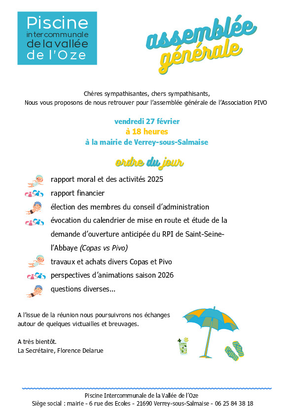 Les bénévoles intéressés pour nous soutenir dans l'organisation et la gestion de la saison 2026 de la piscine intercommunale de la Vallée de l'Oze sont les bienvenus à cette Assemblée Générale...
