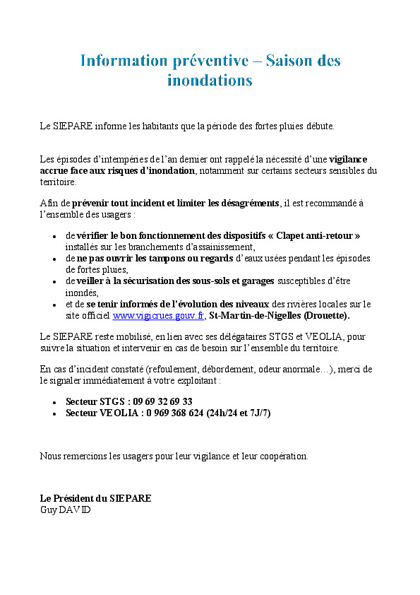Vous trouverez ci-dessous une note d’information du SIEPARE relative à la saison des inondations.