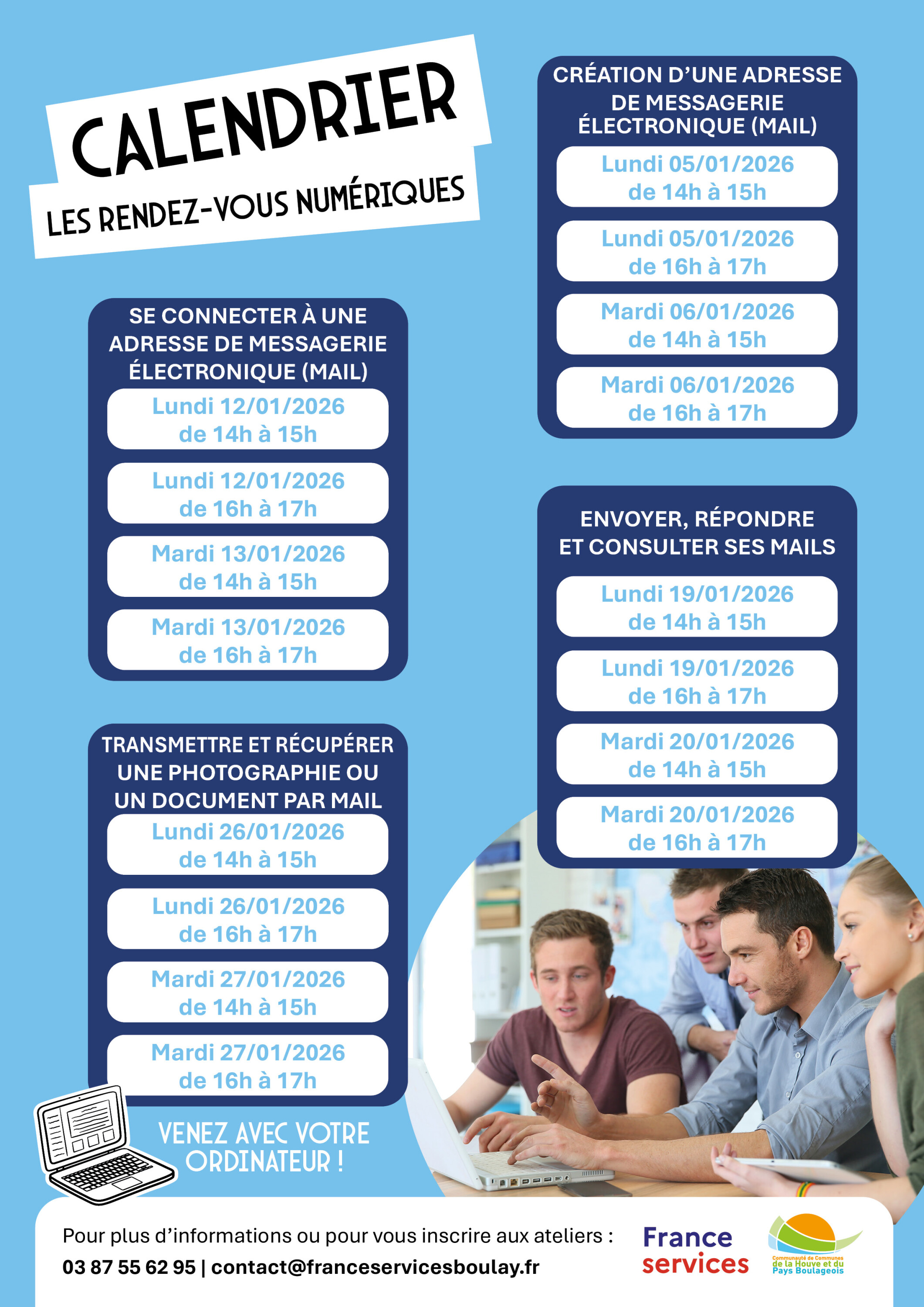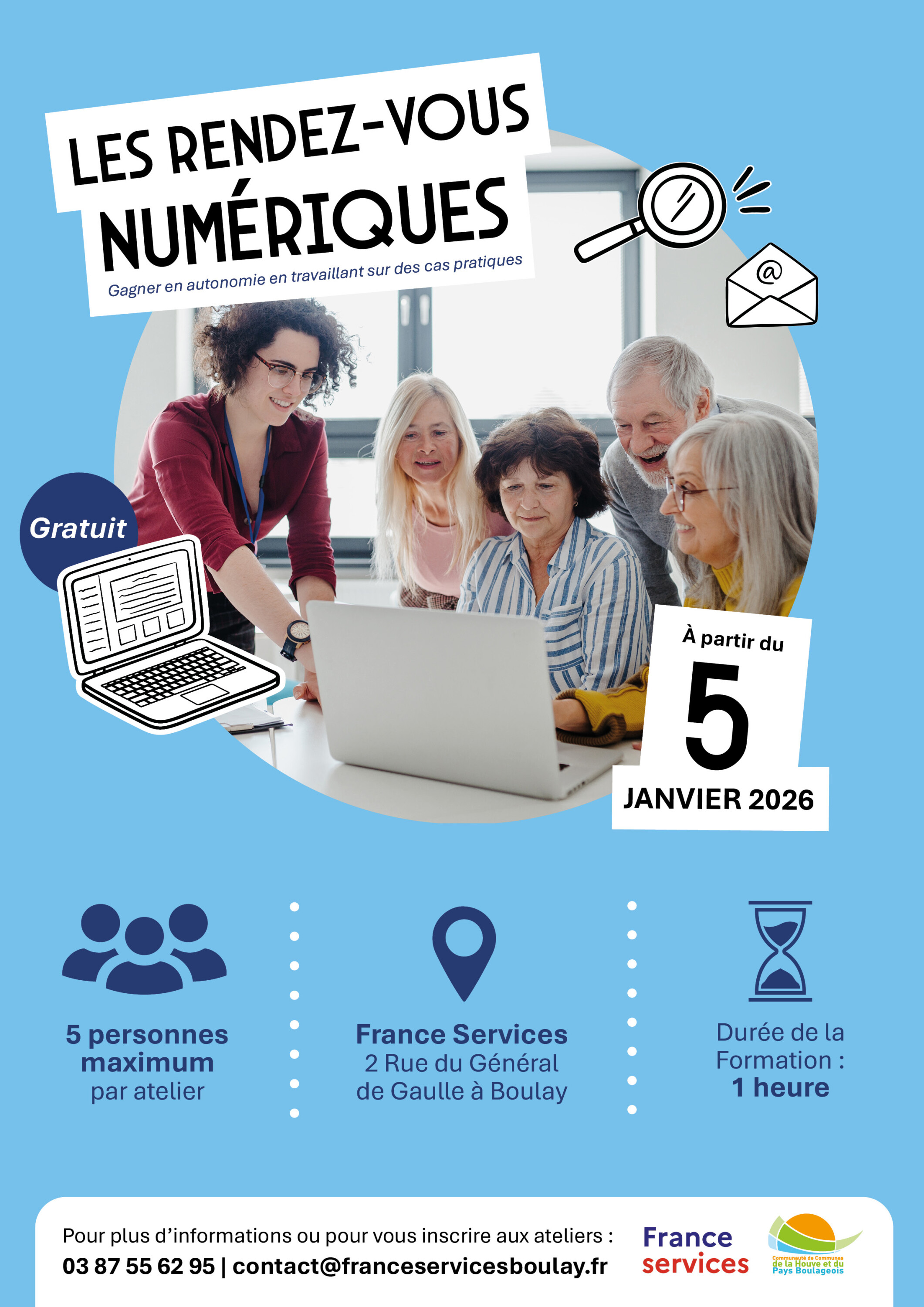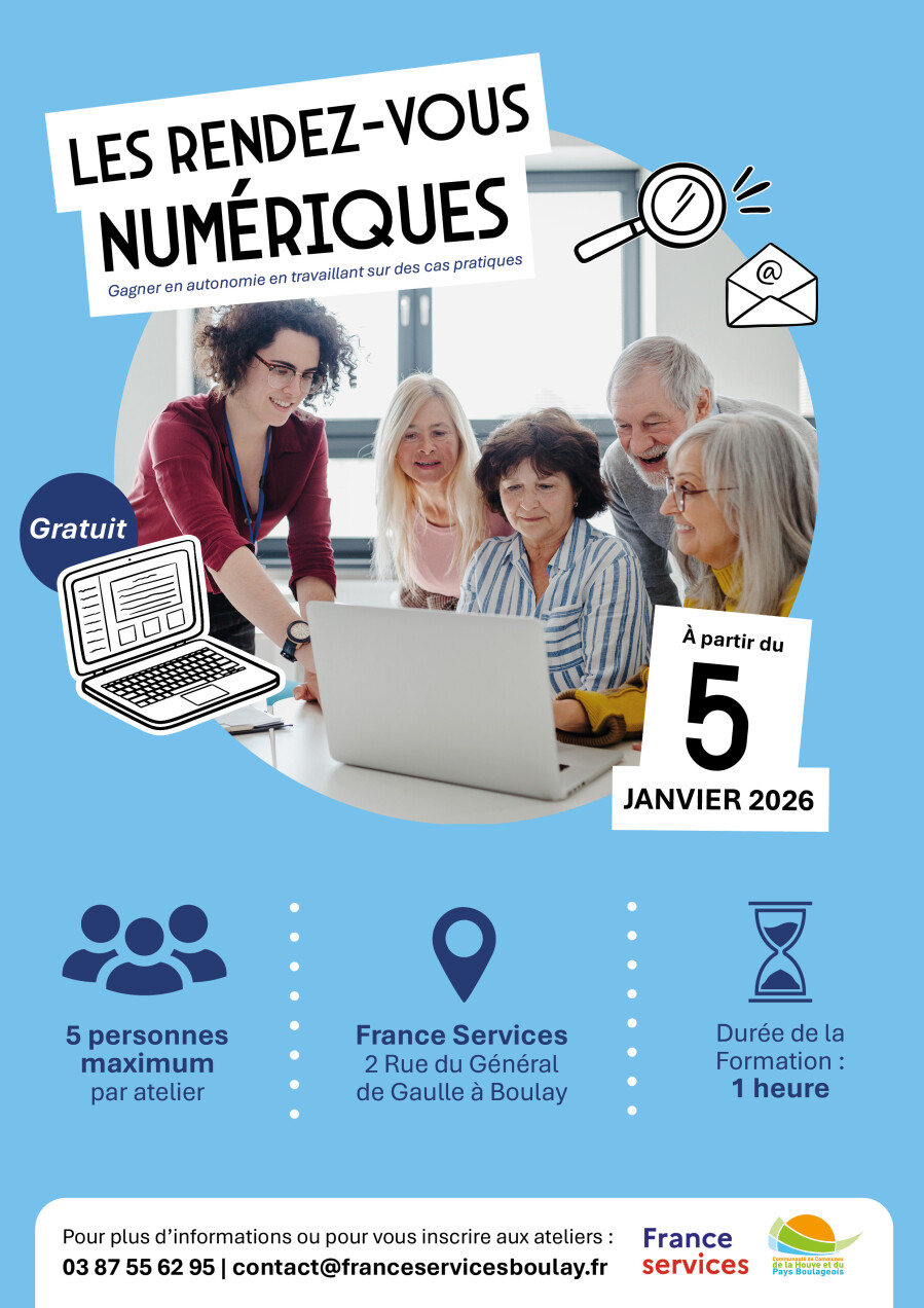 France Services Boulay a mis en place à partir du 05/01/2026, les rendez-vous numériques pour vous aider à adopter les outils numériques afin de les utiliser au quotidien :