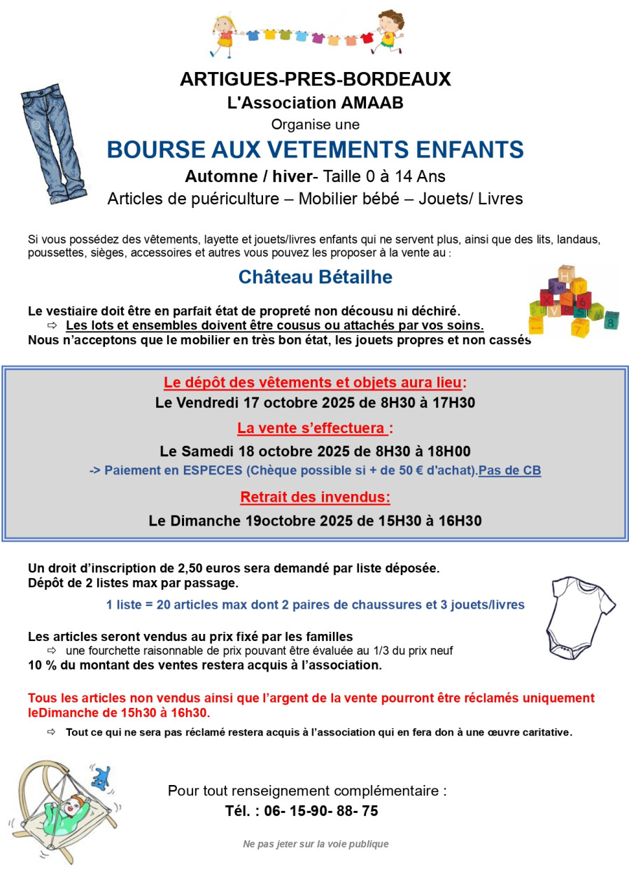 👉️ L'association Assistantes Maternelles Agrées Artigues-près-Bordeaux (AMAAB) organise bientôt sa traditionnelle bourse aux vêtements pour les enfants de 0 à 14 ans !