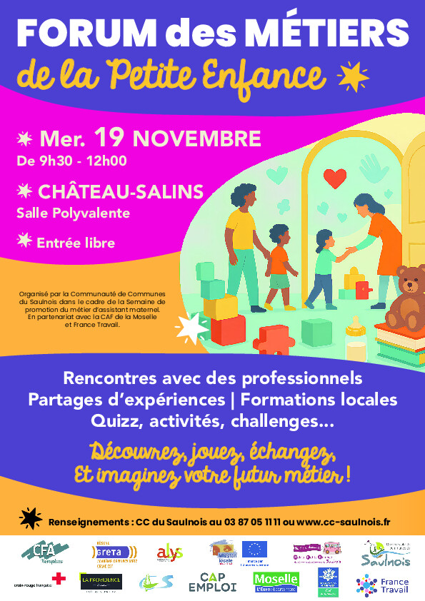 Je vous joins également l'affiche du forum Petite-Enfance que nous organiserons le Mercredi 19/11/2025, dans le but de faire découvrir les métiers de la petite enfance, en structure comme à domicile.