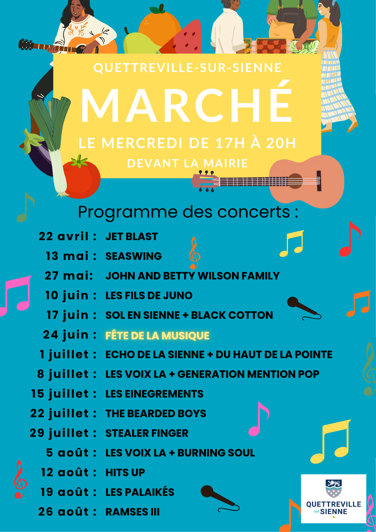 Chaque mercredi de 17h à 20h, retrouvez votre marché devant la mairie dans une ambiance conviviale avec des concerts tout l’été.